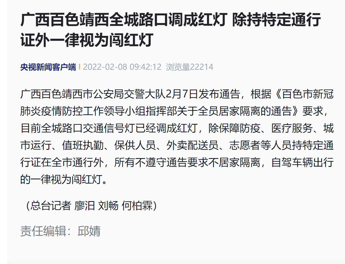 廣西百色靖西市公安局交警大隊(duì)2月7日發(fā)布通告,根據(jù)《百色市新冠肺炎疫情防控工作領(lǐng)導(dǎo)小組指揮部關(guān)于全員居家隔離的通告》要求,目前全城路口交通信號(hào)燈已經(jīng)調(diào)成紅燈,除保障防疫、醫(yī)療服務(wù)、城市運(yùn)行、值班執(zhí)勤、保供人員、外賣配送員、志愿者等人員持特定通行證在全市通行外,所有不遵守通告要求不居家隔離,自駕車輛出行的一律視為闖紅燈。