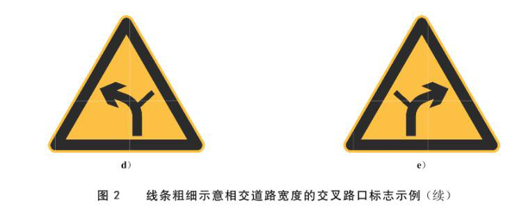 交叉路口警示標(biāo)志用以警告車(chē)輛駕駛?cè)饲胺接薪徊媛房?,注意橫向來(lái)車(chē)。根據(jù)實(shí)際道路交叉的形式盡量選用圖1的圖形。被交路比當(dāng)前道路窄時(shí),可用圖形中的線條粗細(xì)示意相交道路的寬度,示例見(jiàn)圖2。