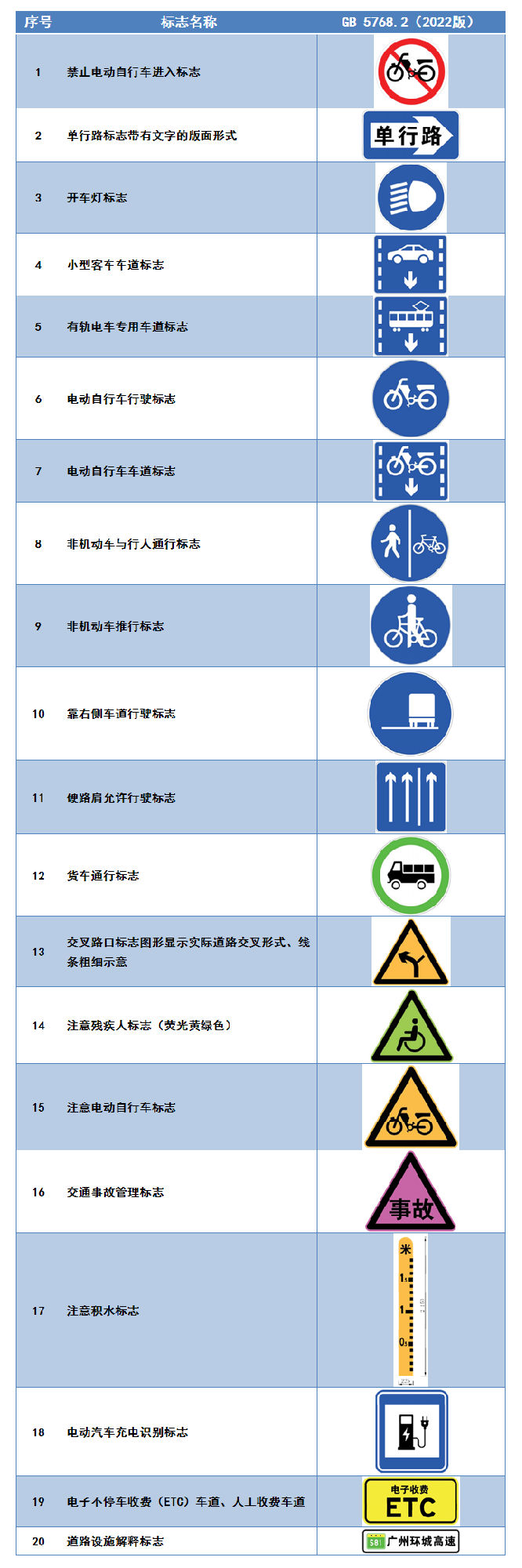 隨著城市化進(jìn)程的加快,道路基礎(chǔ)設(shè)施建設(shè)迅速發(fā)展,為滿(mǎn)足這些新設(shè)施的指引需求,新修訂發(fā)布GB5768.2主要增加了以下20類(lèi)交通標(biāo)志。
