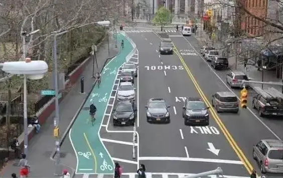 常見的非機(jī)動車道設(shè)置在道路兩側(cè),那可不可以將非機(jī)動車道設(shè)置于道路一側(cè)呢?先來看美國紐約將雙向非機(jī)動車道設(shè)置于道路一側(cè)的案例(見圖1)。需要注意的是,過去幾十年中紐約的道路并沒有非機(jī)動車道,直到現(xiàn)在自行車流量也還很少,這與我國大多數(shù)城市有所不同。此外還需要重視的是,不能只看方案圖漂不漂亮,還要看看方案的背后——交通是否安全。據(jù)報道,2019年紐約市在交通事故中死亡的騎行者是前一年的兩倍多。