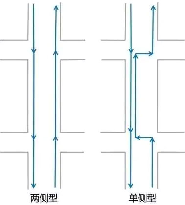 單側(cè)布置的非機(jī)動車道總是要回到雙側(cè)的,一去一回既麻煩又增加危險。圖2是兩種自行車交通組織圖,顯然兩側(cè)型更簡單、方便、連續(xù)性更好,自行車交通組織就應(yīng)如此才安全、受歡迎。再看單側(cè)的方案,騎行者(自行車、電動自行車、快遞員、送餐員)真的會自覺按規(guī)定去單側(cè)繞行嗎?或許他們會選擇捷徑,直行走機(jī)動車道。