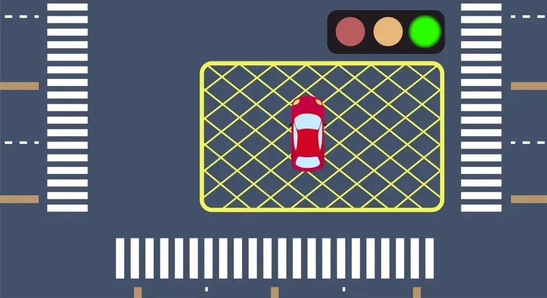 當(dāng)經(jīng)過黃色網(wǎng)格線的路口時(shí),如綠燈處于閃爍狀態(tài)或前方路口處于擁堵狀態(tài),需停車或減速等待。