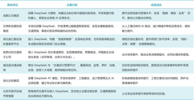 交通行業(yè)本身也是DeepSeek開源的受益者。短短兩個月,公交公司、交警、高速公路管理單位、設(shè)計院等已經(jīng)將其應(yīng)用在隧道管控、城市公交、高速公路管理、工程設(shè)計等方面,在預(yù)測準(zhǔn)確率、響應(yīng)時間縮短、效率提升等方面成效顯著,部分案例如下表所示。