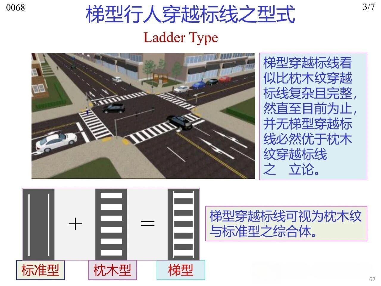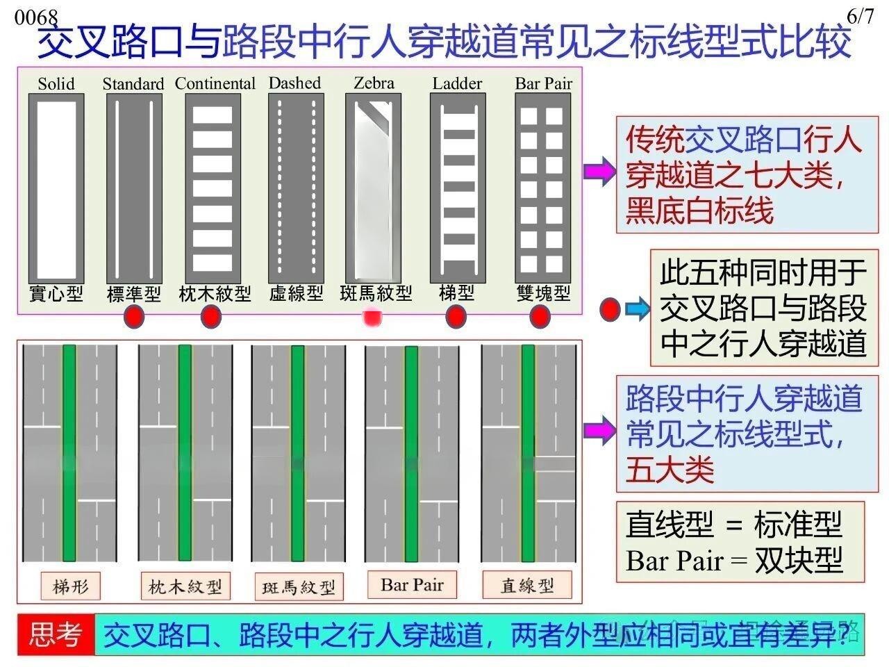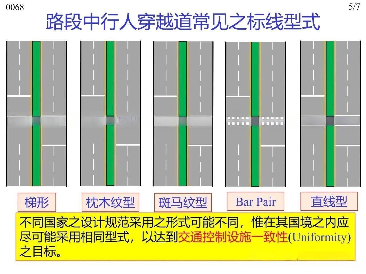行人在橫穿道路時(shí)專供行人使用的人行橫道標(biāo)線,主要分為平面交叉路口處與路段中兩類場(chǎng)景。其中,平面交叉路口與路段中均可使用梯型、枕木紋型、斑馬紋型、雙塊型(Bar Pair)、直線型(標(biāo)準(zhǔn)型)這五種型式,平面交叉路口傳統(tǒng)上可使用實(shí)心型、虛線型兩類。無(wú)論采用何種標(biāo)線型式,全國(guó)范圍內(nèi)或至少在同一城市內(nèi)保持一致性,以實(shí)現(xiàn)交通控制設(shè)施的一致性(Uniformity)。