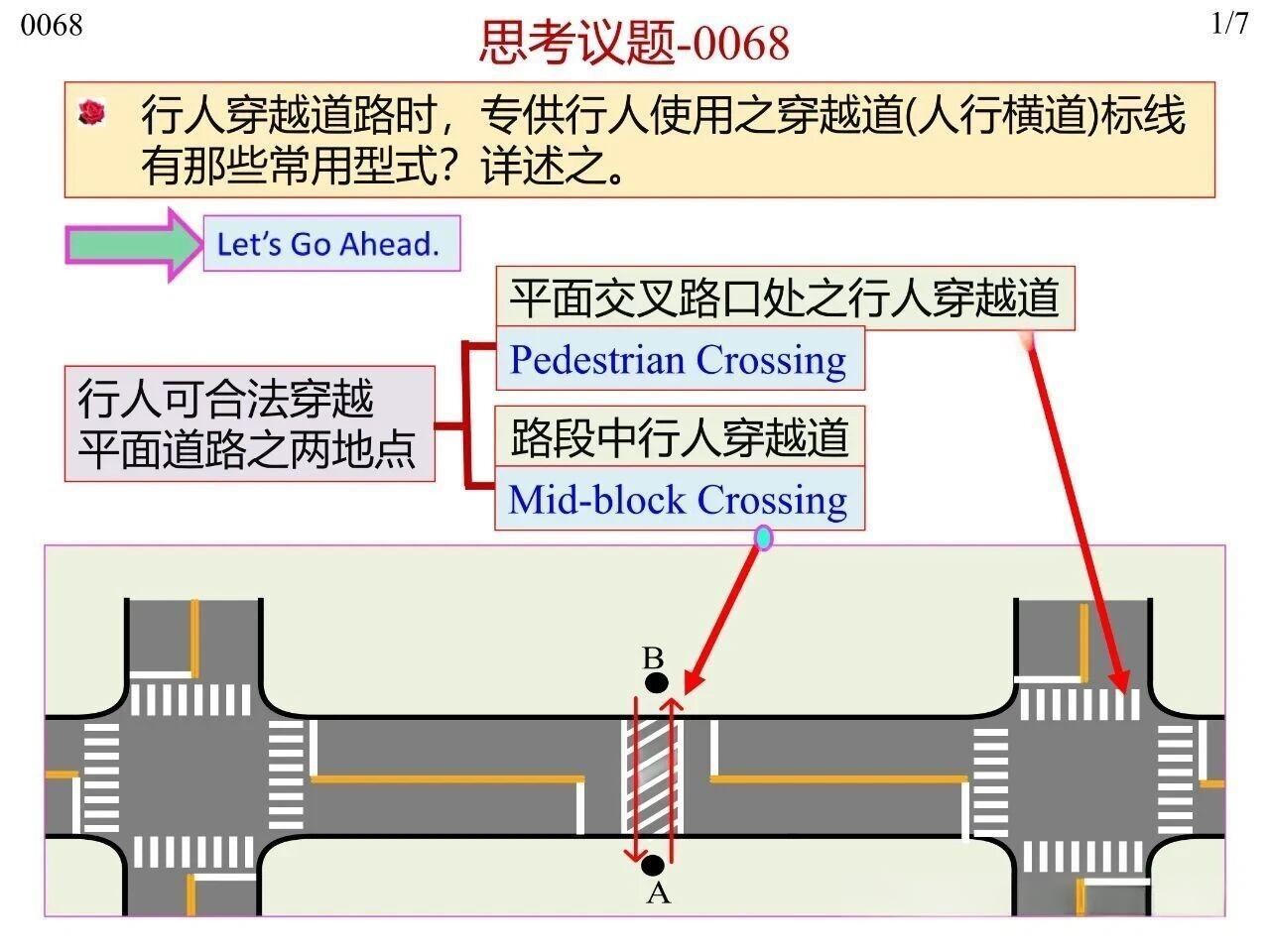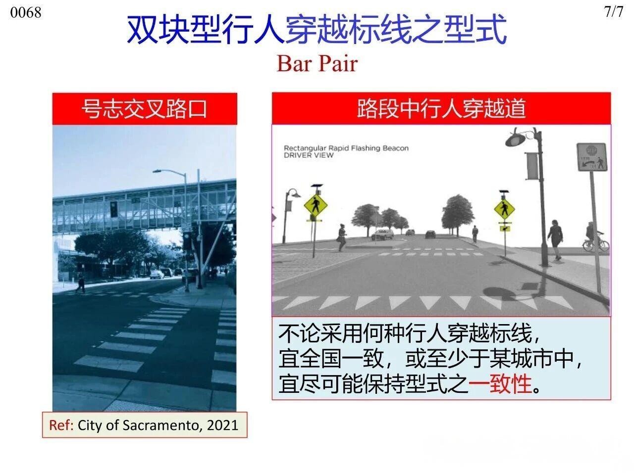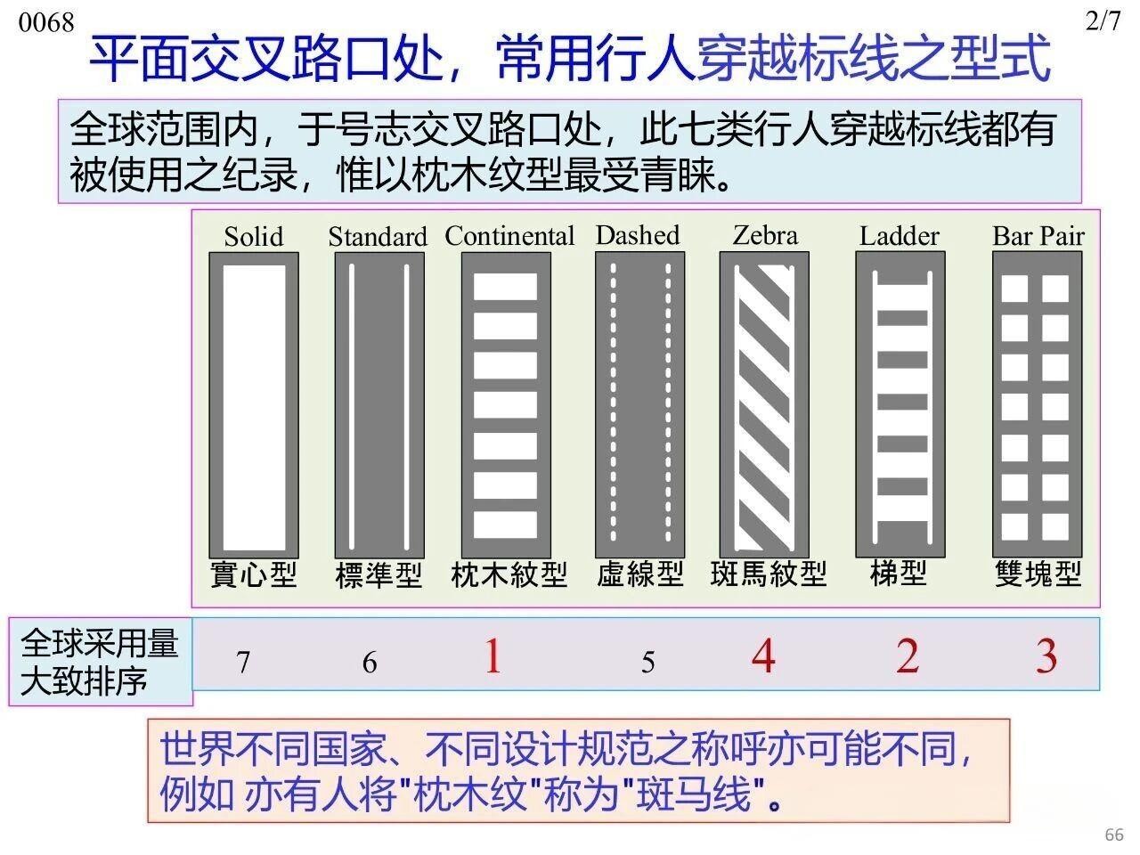 行人在橫穿道路時(shí)專供行人使用的人行橫道標(biāo)線,主要分為平面交叉路口處與路段中兩類場(chǎng)景。其中,平面交叉路口與路段中均可使用梯型、枕木紋型、斑馬紋型、雙塊型(Bar Pair)、直線型(標(biāo)準(zhǔn)型)這五種型式,平面交叉路口傳統(tǒng)上可使用實(shí)心型、虛線型兩類。無(wú)論采用何種標(biāo)線型式,全國(guó)范圍內(nèi)或至少在同一城市內(nèi)保持一致性,以實(shí)現(xiàn)交通控制設(shè)施的一致性(Uniformity)。
