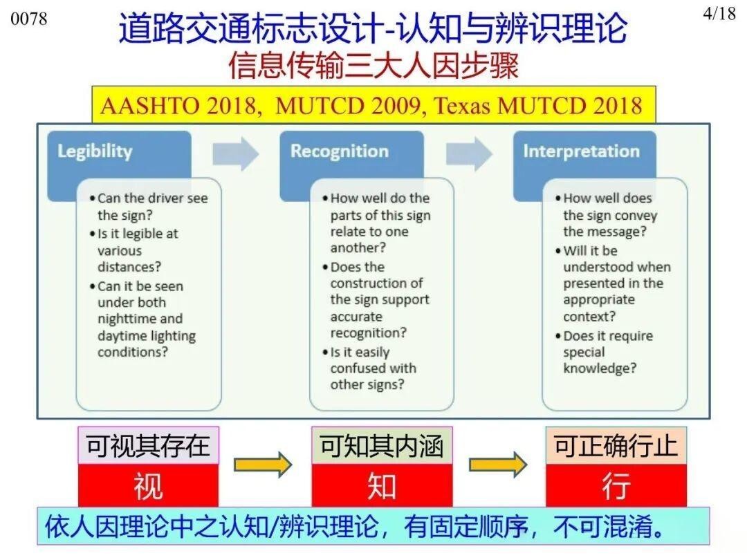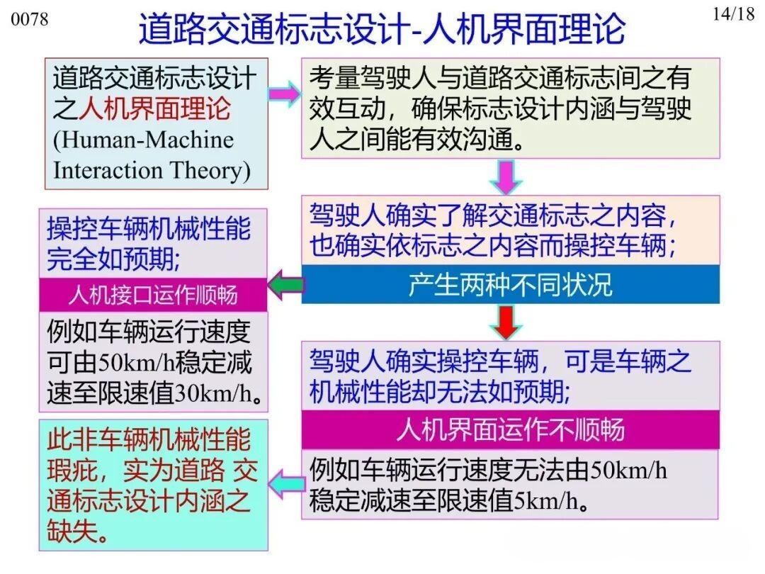 12)人機交互理論(Human-Machine Interaction Theory): 駕駛?cè)伺c道路交通標志需有效互動,確保駕駛?cè)死斫鈽酥?,并以此為?jù)操控車輛?!叭藱C界面順暢”是指駕駛?cè)丝剀嚂r,車輛機械性能符合預期。需避免:一是駕駛?cè)瞬倏剀囕v,車輛機械性能達不到預期;二是標志設(shè)計缺失,導致駕駛?cè)宋窗窗踩蟛倏剀囕v,而不是車輛機械性能達不到安全要求;