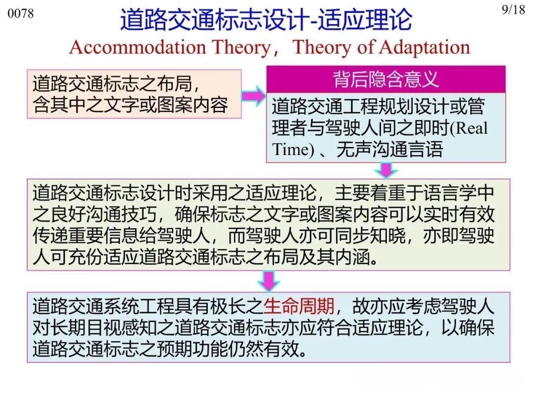 7)適應(yīng)理論(Accommodation Theory):標志是無聲的信息傳遞工具,應(yīng)保障信息及時傳遞,保證駕駛?cè)碎L期適應(yīng)標志傳遞的信息;
