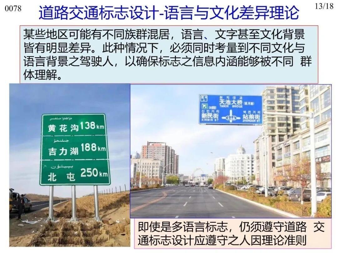 11)語言與文化差異理論:針對多民族混居、語言文字及文化背景存在明顯差異的地區(qū),設(shè)計時應(yīng)考慮不同文化與語言背景的駕駛?cè)?,采用多語言標志,確保標志的信息內(nèi)涵能被各類群體理解。同時,也要嚴格遵守標志設(shè)計應(yīng)遵循的人因理論,不可因語言差異忽視設(shè)計規(guī)范;