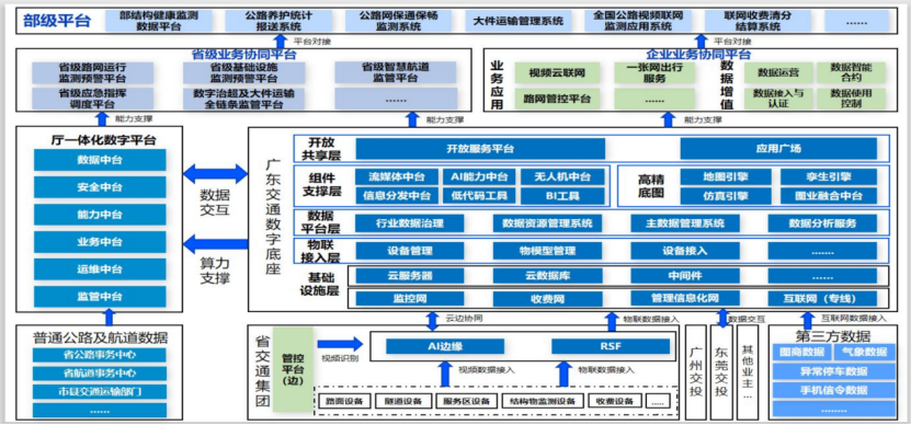 首先仍以數(shù)字底座為依托,該底座具有三大特點(diǎn):一是構(gòu)建分層解耦體系,以固定技術(shù)形態(tài)應(yīng)對多變業(yè)務(wù)需求;二是堅(jiān)持?jǐn)?shù)據(jù)為本,通過《廣東交通數(shù)字底座暫行技術(shù)規(guī)定》《廣東交通數(shù)字底座公路數(shù)據(jù)接入暫行技術(shù)規(guī)定》兩份文件(且文件持續(xù)更新迭代),推動(dòng)數(shù)據(jù)標(biāo)準(zhǔn)化與統(tǒng)一;三是實(shí)現(xiàn)能力共享,對AI、地圖、低空等共性技術(shù)與資源采用統(tǒng)一供給模式。