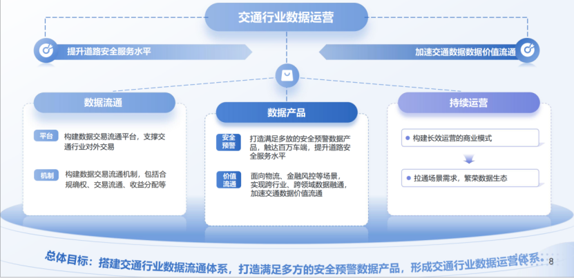 綜上,當(dāng)前工作圍繞“聚力數(shù)據(jù)運(yùn)營,夯實(shí)道路安全根基;暢通數(shù)據(jù)價(jià)值,加速交通數(shù)據(jù)賦能”展開,無論是數(shù)據(jù)供給方、使用方還是加工方,均可參與其中。期待各方共同推動(dòng)數(shù)據(jù)市場繁榮,助力智慧交通發(fā)展。