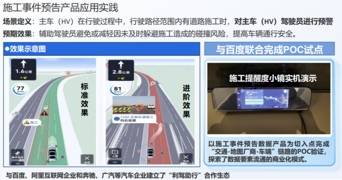 以施工事件預(yù)告產(chǎn)品為例,高速公路的臨時(shí)施工與計(jì)劃施工信息對駕駛安全至關(guān)重要,通過匯集施工時(shí)間、地點(diǎn)、回避方案等數(shù)據(jù),形成標(biāo)準(zhǔn)化數(shù)據(jù)產(chǎn)品,可有效降低因司機(jī)對施工信息不知情引發(fā)的事故風(fēng)險(xiǎn)。