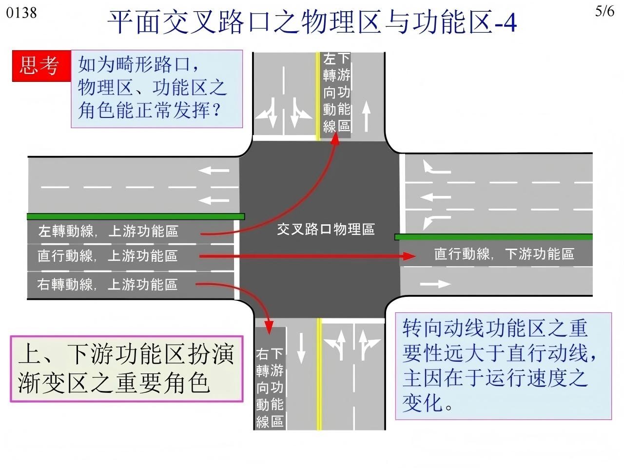 平面交叉路口影響區(qū)(Influence Area)由物理區(qū)(Physical Area)與功能區(qū)(Functional Area)組成,對(duì)道路運(yùn)輸效能與安全績(jī)效影響深遠(yuǎn)。交叉路口僅存在一個(gè)物理區(qū),是兩道路交接處的共用區(qū)域(停止線前方虛擬區(qū)域);其對(duì)任一交通流線具有“承前啟后”功用,需能同時(shí)適應(yīng)上下游功能區(qū)的車道配置,銜接進(jìn)口道與出口道的車流過渡。功能區(qū)是車輛完成穿越交叉路口駕駛?cè)蝿?wù)的長(zhǎng)條狀區(qū)域,按位置分為上游(對(duì)應(yīng)進(jìn)口道)與下游(對(duì)應(yīng)出口道),因交通流線(直行、左轉(zhuǎn)、右轉(zhuǎn)等)不同存在多個(gè)功能區(qū);同時(shí),功能區(qū)扮演漸變區(qū)角色,供駕駛?cè)嗽趨^(qū)域內(nèi)調(diào)整駕駛?cè)蝿?wù)(如加減速)。此外,任何交通流線均遵循“上游功能區(qū)(進(jìn)口道)→物理區(qū)→下游功能區(qū)(出口道)” 的路徑,使交叉路口交通流線遠(yuǎn)比路段復(fù)雜;只有確保物理區(qū)與上下游功能區(qū)的車道配置相對(duì)應(yīng)、協(xié)同適配,才能有效保障交叉路口車流有序運(yùn)行,發(fā)揮其交通銜接作用。